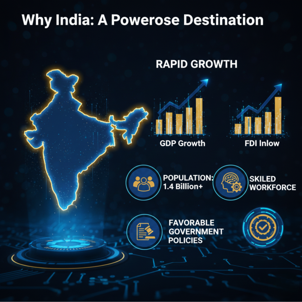 India is the world's fastest-growing major economy with 7%+ GDP growth, 1.4B consumer market, improving ease of doing business, and strong government incentives like "Make in India" and PLI schemes. The digital transformation and young workforce make this the ideal time for international expansion.